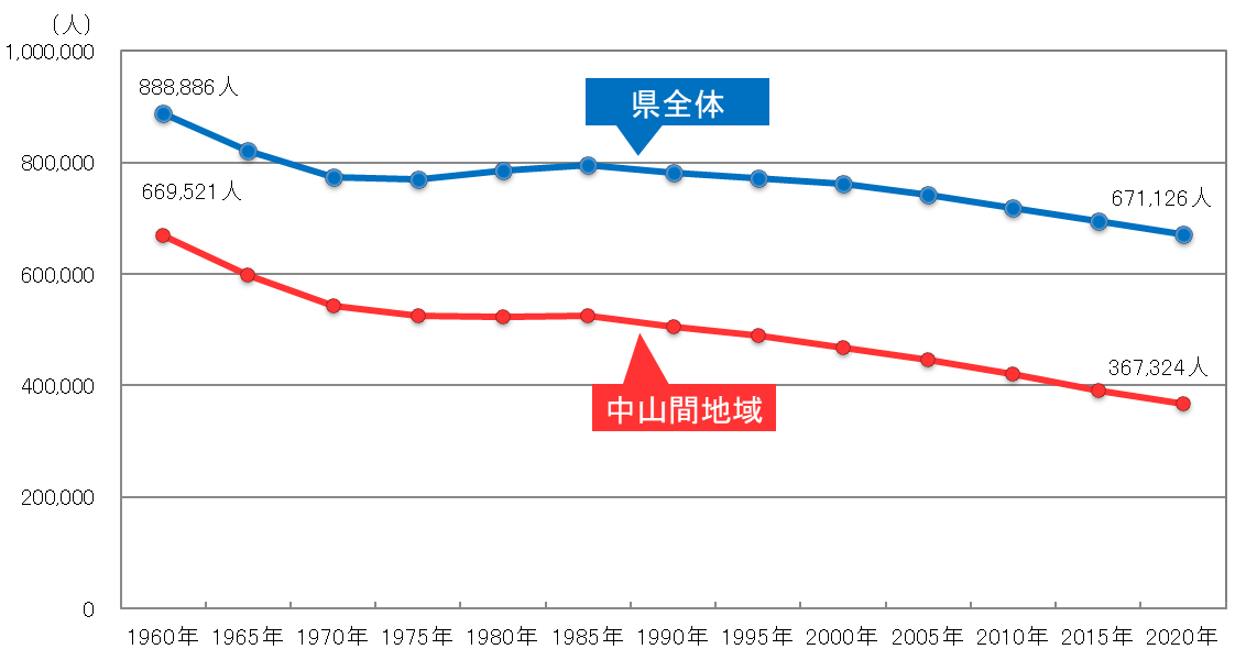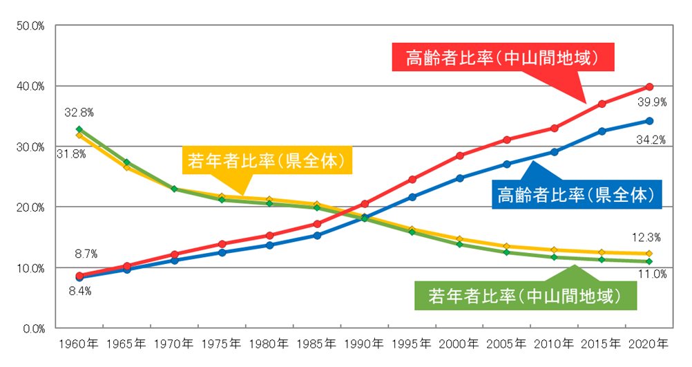 県内の中山間地域では、人口の流出や高齢化の進行により、地域づくりの担い手不足が深刻化し、買い物、金融、医療介護などの日常生活に必要な機能・サービスの確保が困難になる集落が増えています。(下図参照)